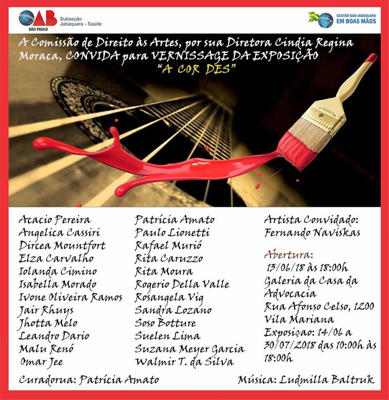 And it may be that you live many are present in the colors vanished around the screens, in many forms of language, full of metaphors. In the white spaces of the screens, both enchantment poured songs, poetry and is now delighting São Paulo, in the gallery of the House of Law, Afonso Celso Street, 1200, in Vila Mariana. Dr.. Cíndia Regina Moraca, Director of Arts Law Commission of OABSP, invites for the event that began on 14 June and end on 30 July.