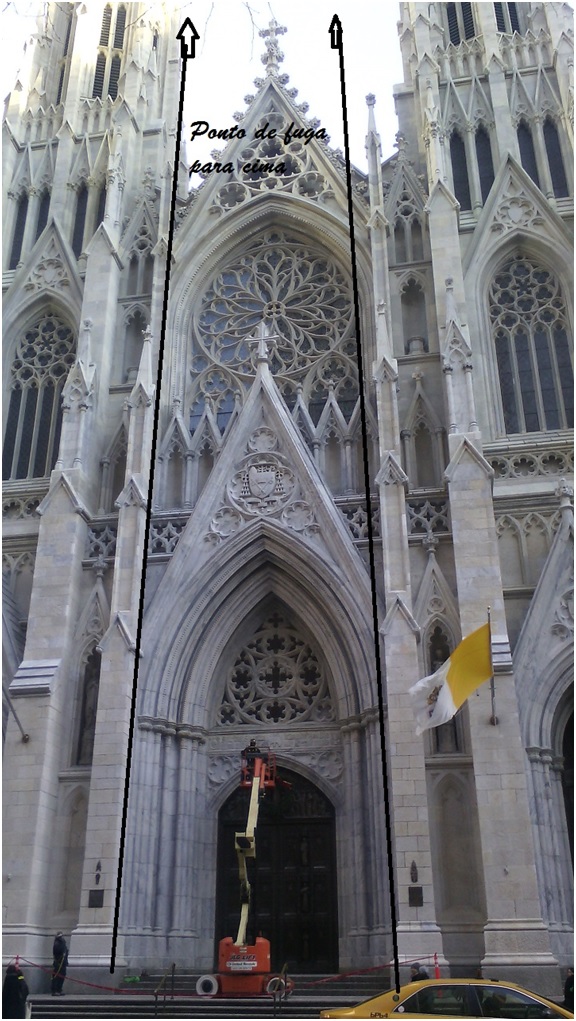 En una dibujo puede haber más de un punto de fuga o muchos puntos de fuga, dependiendo de la posición que ocupa cada objeto en la escena. Y el punto de fuga todavía puede ser dirigido al centro, a un lado o incluso hacia arriba. En la figura 4, por ejemplo, puede verse que el observador se posiciona en la parte inferior de la iglesia; el horizonte está al lado de la iglesia, se interpone en su nivel de los ojos; y las líneas del punto de fuga convergen hasta.
