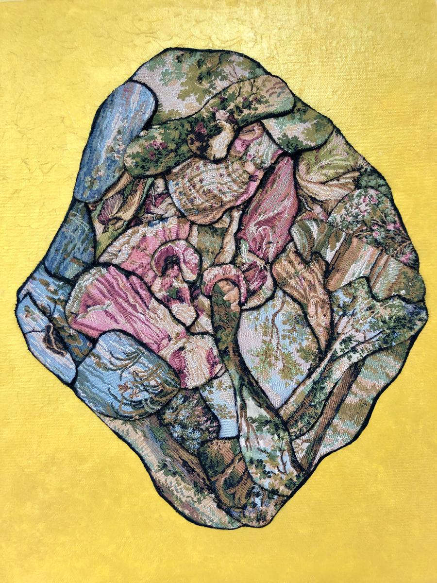 El trabajo de pintura y collage sobre esos valiosos textiles cruzó el océano Atlántico con el artista , cuando decidió mudarse a Lisboa, temprano 2020. Y dio origen a la colección “Escape”, que desde el dia 3 de mayo, estará en exhibición en la recién inaugurada galería Castra Leuca Arte Contemporânea, en Castelo Branco.