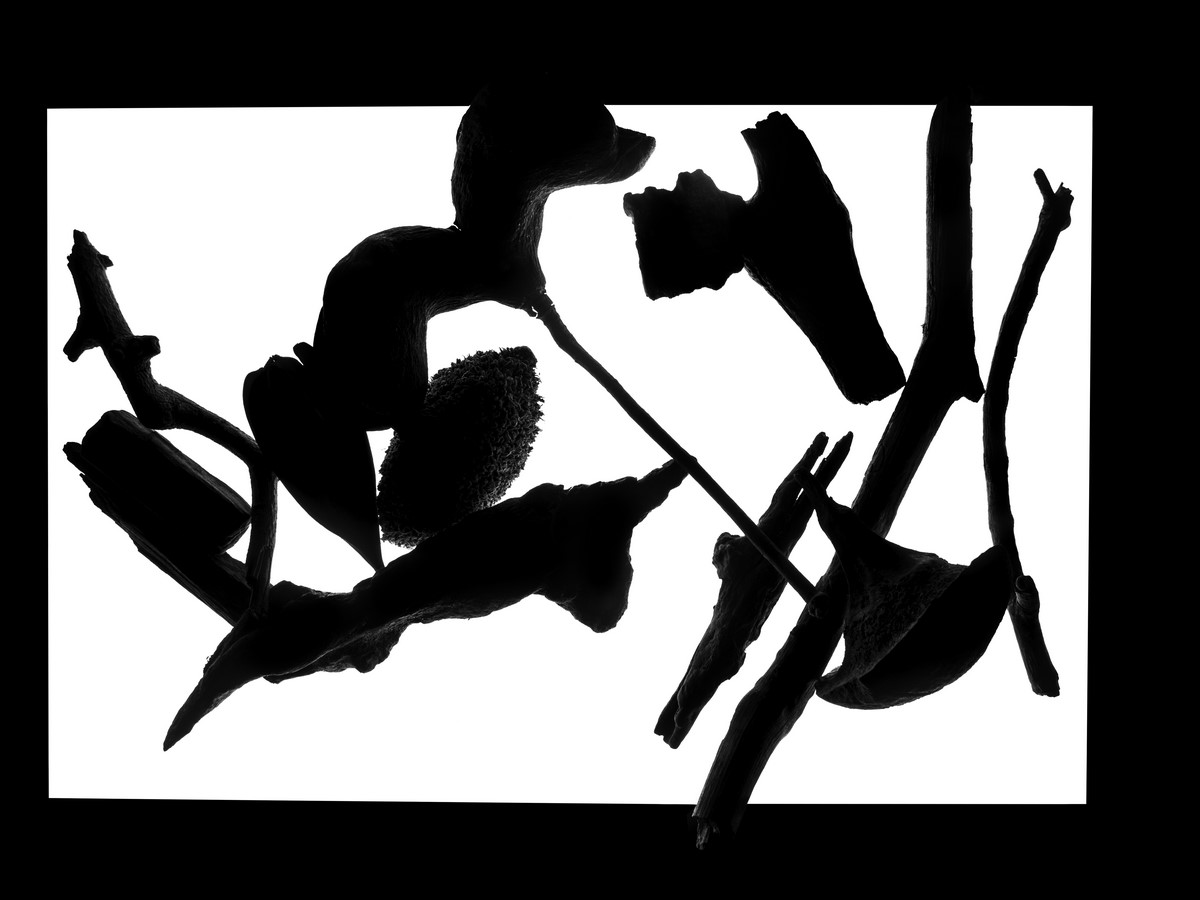 Limite Oblíquo é resultado dessa memória guardada há tantos anos. Recluso durante a pandemia, período definido por ele como “momento de espera”, imergiu em seu trabalho e resolveu dar vida aos sedimentos utilizando sua mesa de luz. Ele conta que pegou a caixa com os sedimentos e foi colocando um a um sobre a mesa, fotografando as imagens com a luz que vinha de baixo para cima. Cada peça fotografada foi colocada em uma outra caixa. Quando acabou esse primeiro processo, recomeçou um segundo, tirando os sedimentos já fotografados da segunda caixa para remontar outras possibilidades. Um a um todos voltaram para a caixa original.