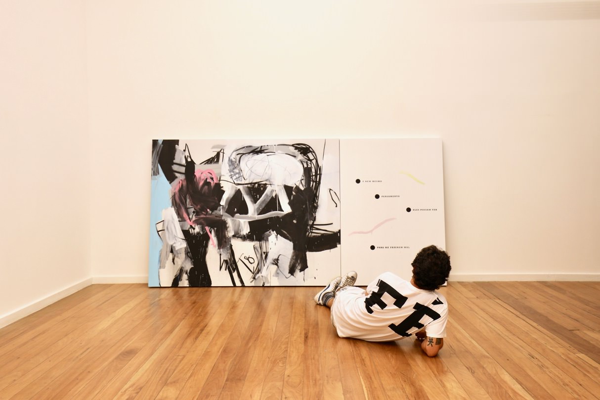 Nesta exposição, algumas explorações mais sóbrias do verde, do azul – outras mais radicais, trazem o rosa e laranja neon da década de 90, entrepostas pela radicalidade dos pretos, explorados pelo carvão, spray, e esmalte sintético.