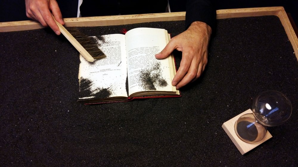 De acordo com o artista, a nova performance também joga foco na origem da palavra. “O livro é apenas um objeto e se torna algo somente quando descoberto, aberto e lido. Procurar os livros no meio de 100 quilos de areia, abrir uma página aleatoriamente e ler por apenas dois minutos é uma busca por pequenas preciosidades, um verdadeiro trabalho de arqueologia”, explica ele.