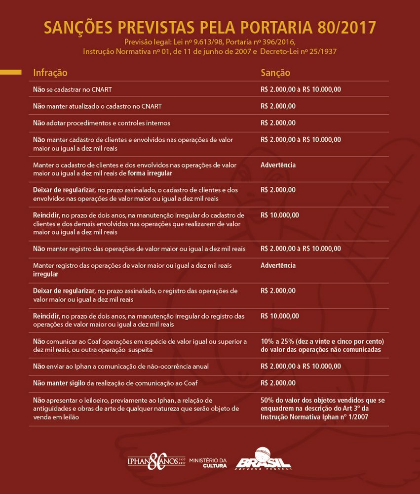 No âmbito das ações de combate à lavagem de dinheiro e financiamento do terrorismo, o Instituto do Patrimônio Histórico e Artístico Nacional (Iphan) publicou em 9 de março a Portaria nº 80 de 2017, estabelecendo sanções para os negociantes de obras de arte e antiguidade que não se adequarem às normas do setor. A medida também define diretrizes para as ações de fiscalização a serem executadas pelo Instituto.