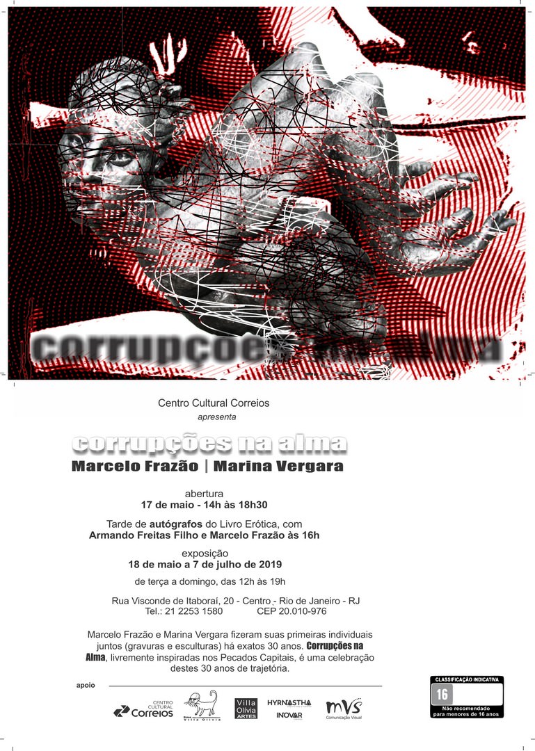 A primeira mostra dos dois artistas remonta ao final dos anos 1980. Agora, Marcelo Frazão e Marina Vergara se juntam mais uma vez, desta vez na exposição “Corrupções na Alma”, que abre dia 17 de maio, das 14h as 18:30, no Centro Cultural Correios.