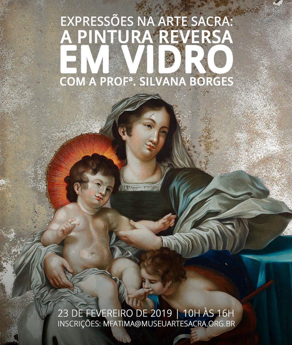 Oficina prática: A manufatura de uma pintura reversa em vidro, com demonstração da execução do desenho, aplicação das cores e a douração sobre vidro. A oficina prática aborda conteúdos teóricos e práticos pelo estudo do objeto artístico na sua simbologia (iconografia) e materialidade (técnicas artísticas), tornando a expressão plástica atingível pelo uso de materiais simples e acessíveis.