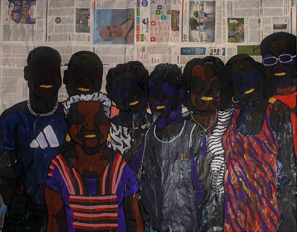 The series 'Destruction of Markets', whose research began in 2019, portrays different personalities – Maju Coutinho, Emicida, Elza Soares, Mano Brown, Baco Exu do Blues, Basquiat, Dona Onete, Nath Finance, Carolina Maria de Jesus, Daiane dos Santos, Viola Davis, among other – who have achieved success in their areas of expertise and, with the sensitivity of Guilherme Almeida, are portrayed with ‘smiles’ filled with gold and silver. In Destruction of Markets I, “the series of portraits on newspaper, the largest and main painting is a proud portrait of his family, echoing gratitude. All the others are figures that the artist considers as inspiration., those who represent that it is possible for a black person to be victorious and successful in all areas” points out the curator.