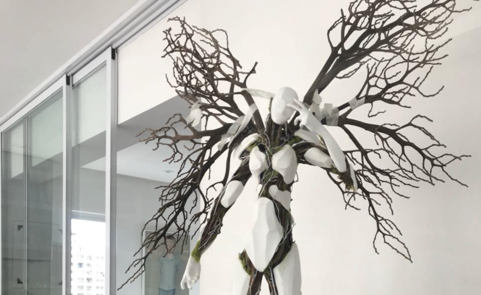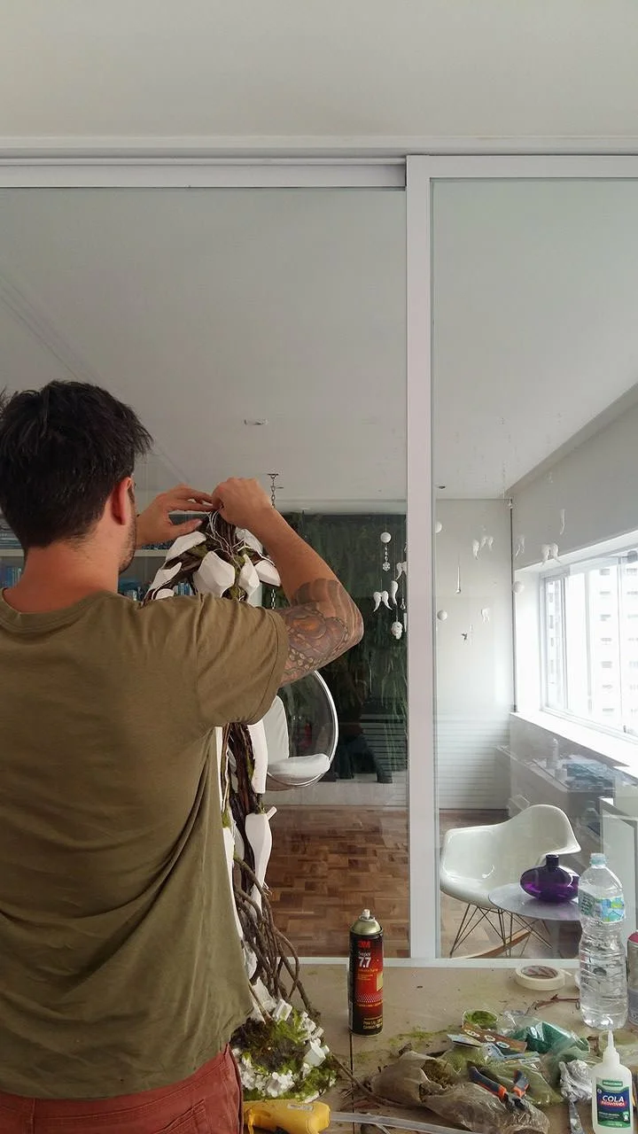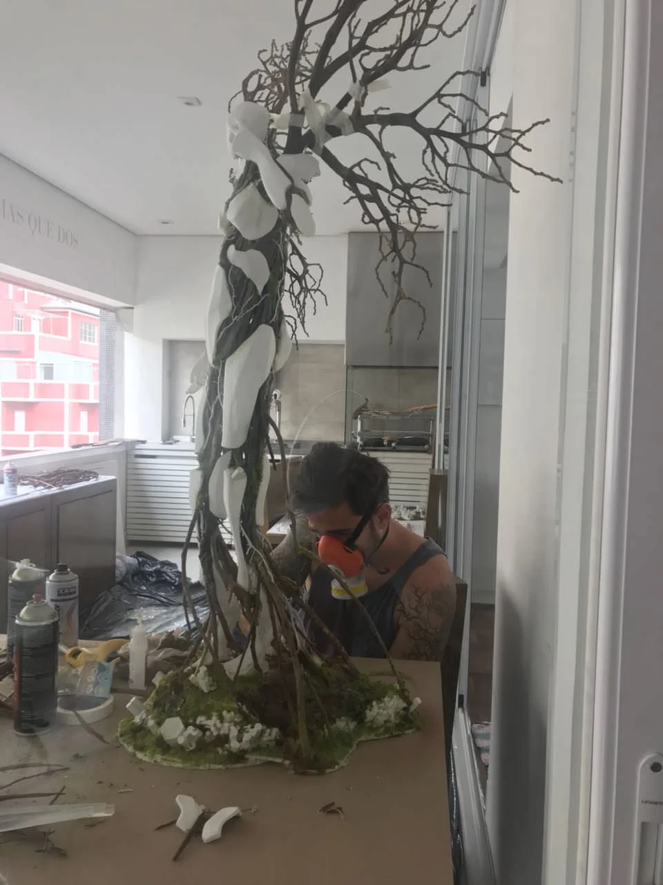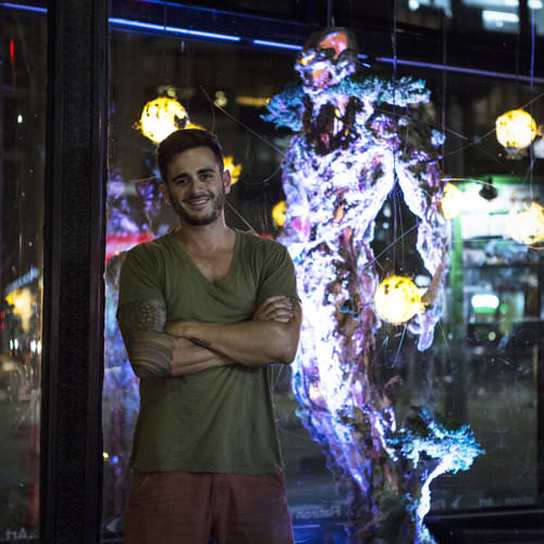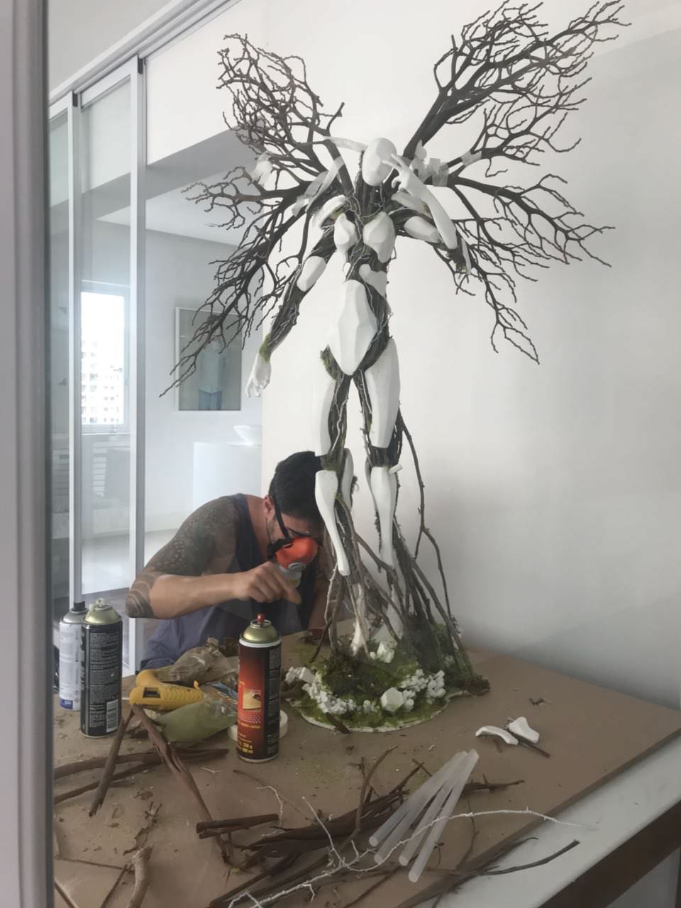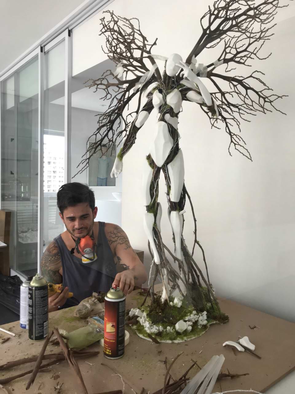 Recently the sculptor exposed the giant work Golemecha, with its more than two meters high, no icônico Flatiron Building’s ProwArtspace. The sculpture joins Jewish folklore (the legendary figure protective creature Golem) with the famous giant robots of Japanese pop culture, known as "roving". Using 3D parts, moss, wire meshes, roots, Bonsai and LED lights, the sculptor creates a kind of advocate for all, that arises from the tradition of marriage, Nature and technology.