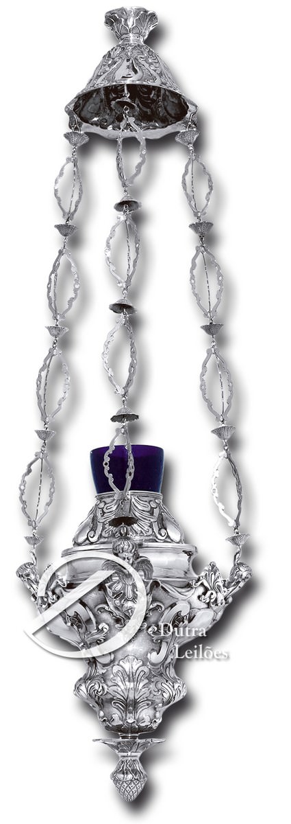 Finally, the cream of the auction catalog there is silver chandelier drawn back and carved with baroque inspiration, and phytomorphic elements and scrolls in relief. The piece presenta three streams in suspensórias balonet hollow and connected to three small figures cupidos. In the body there is only the mark of the pigtail. The object has 117,5 cm and was made in Brazil, between the centuries 18 and 19.