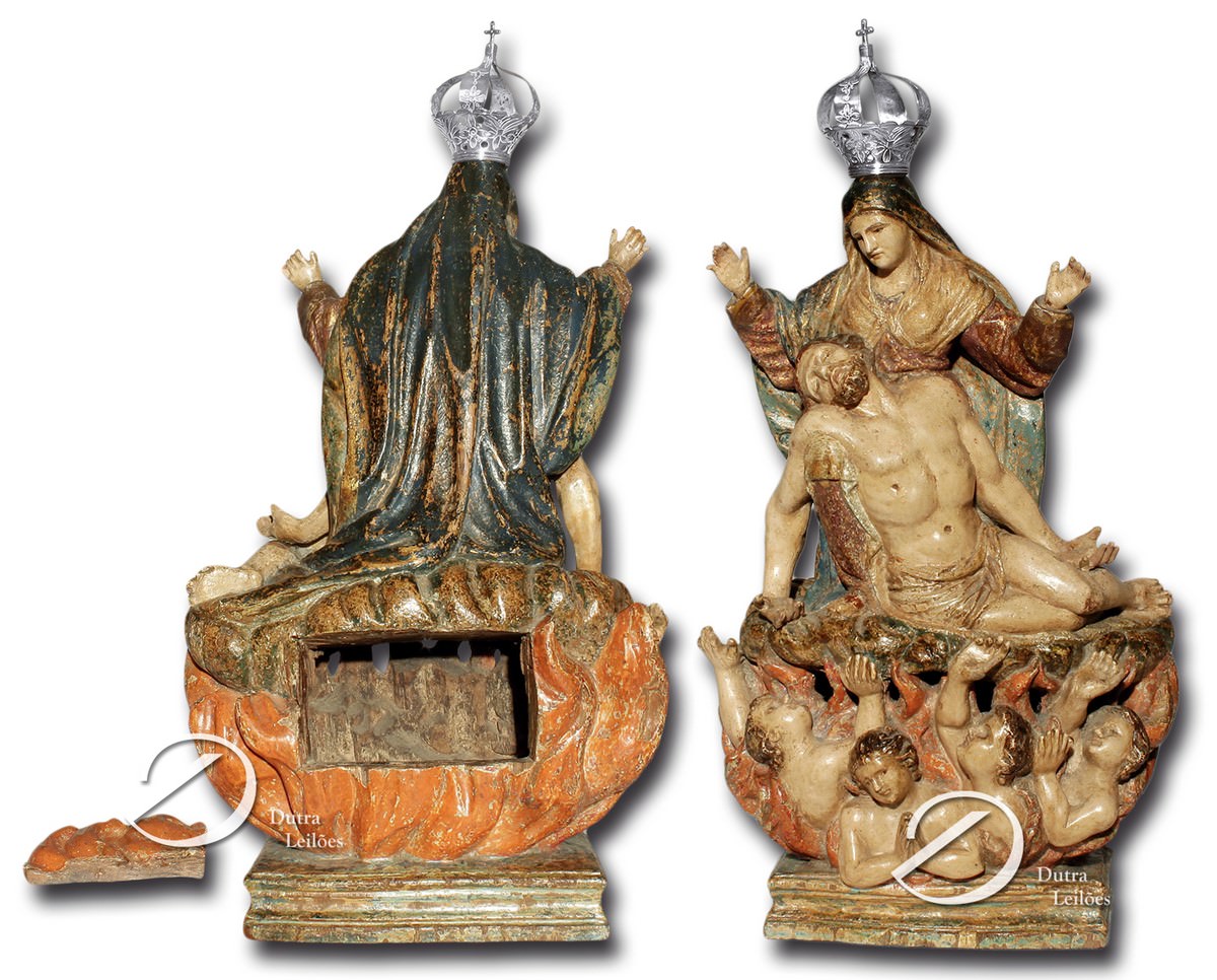 The Holy Pau Oco. Pieta is iWood mage carved policrômica, discrete gilding, representing Jesus Dead Body right, in the arms of the Virgin Mary covered with mantle. It contains sgraffito, bomb panejamento, Leaked based on Purgatory angels, as if they were caryatides. The rear face of the horizontal base plate, removable, closes the clearance. She has 35 cm and was developed in Brazil in the century 18. The piece iscompanhada by a silver crown.