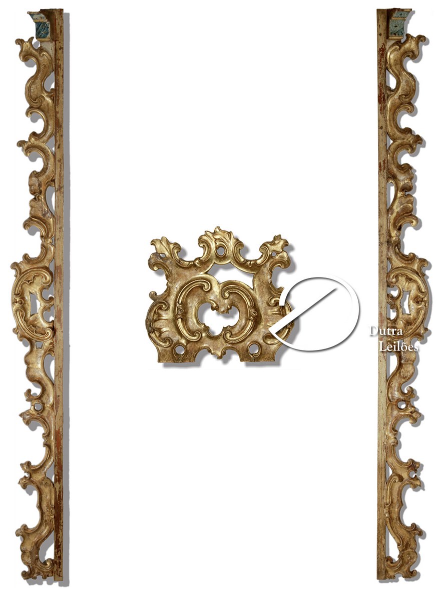 There are also the same artist, among other items, one Pair of lateral pulleys it is a Finial altar from patinated wooden drawn with traces of gilding, decorated with scrolls. The finial is carved wood in the central medallion format leaked, with scrolls and draping. The dimensions of pulleys are 22 cm x 237 cm high, while the finial has 63 cm x 56,5 cm high. The works are also the century 18 and they were completed in Minas. Including your photos even been reproduced Burning in the book Baroque and syncretic Luso-Afro-Brazilian, Museum Afro Brazil, curated by sculptor Emanoel Araujo.