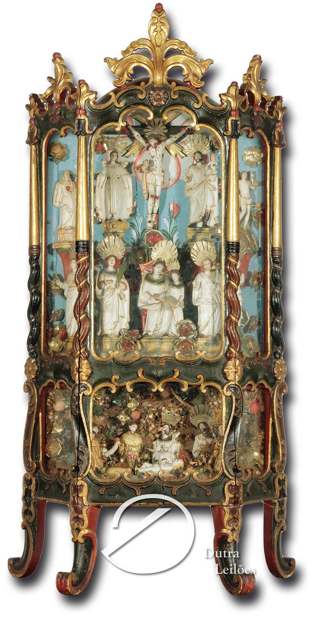 In highlights list is to Dobby or wood Lapinha polychrome with soapstone images. The body is divided into two niches, that being at the top is the Lord Jesus Christ crucified flanked by Santa Gertrudes, Our Lady of Mercy, St. Joseph boots, Saint Sebastian, followed by San Antonio, Santa Luzia, Santana, San Joaquin and San Manuel. All are on small pedestals. In the lower niche there is the nativity scene with the three wise men, the Holy Family, Divino Espírito Santo, a shepherd and animals. The internal and external painting exposes flowers polychrome with a predominance of green and red shades, Burnished gold finished. The furniture is supported on four legs and has cornering 92 cm high. It was produced in Brazil, in the century 19, in Minas.