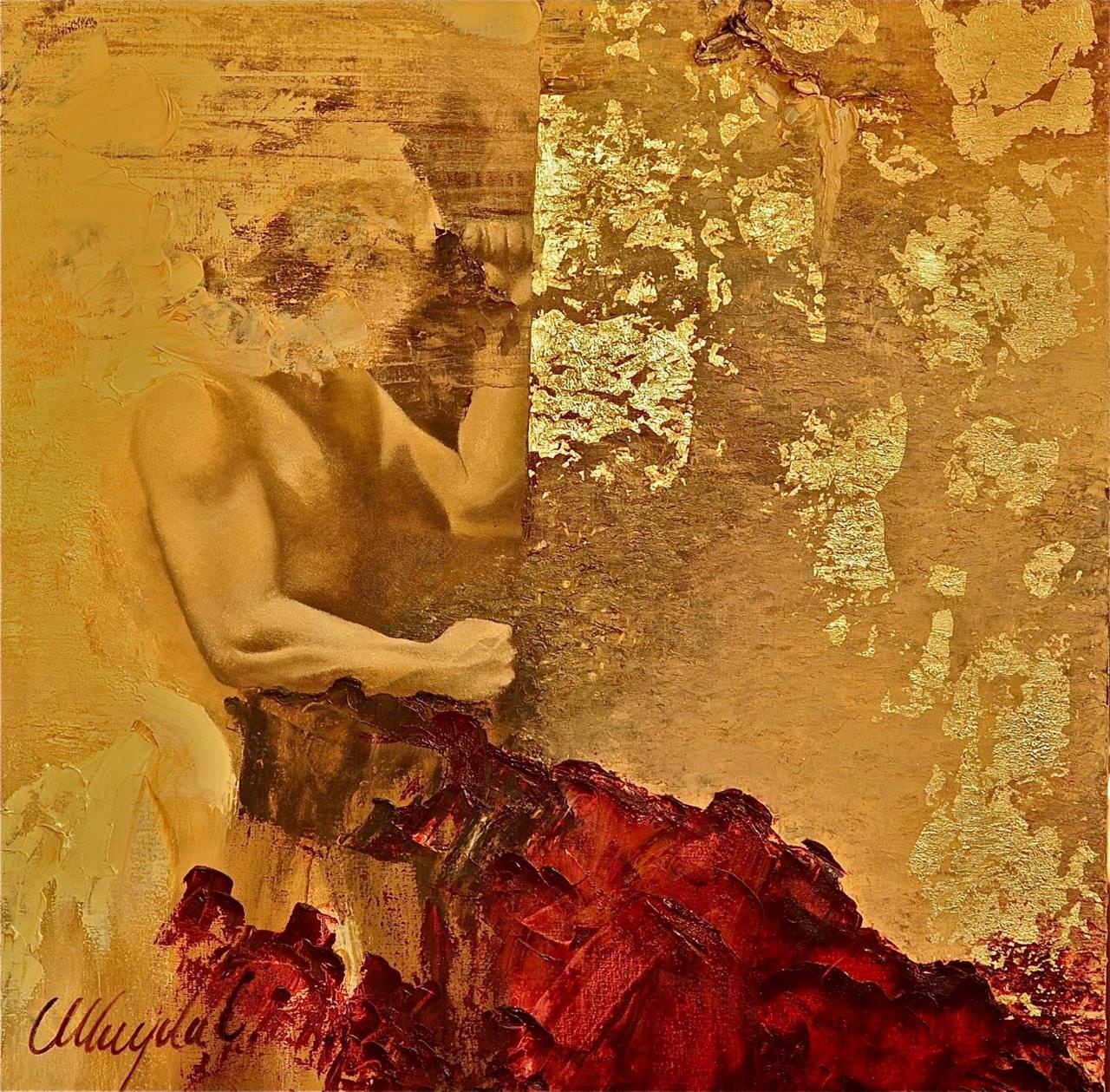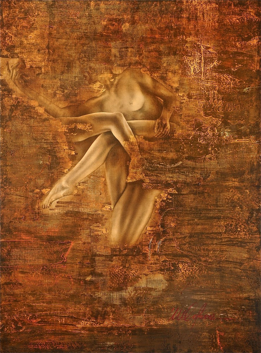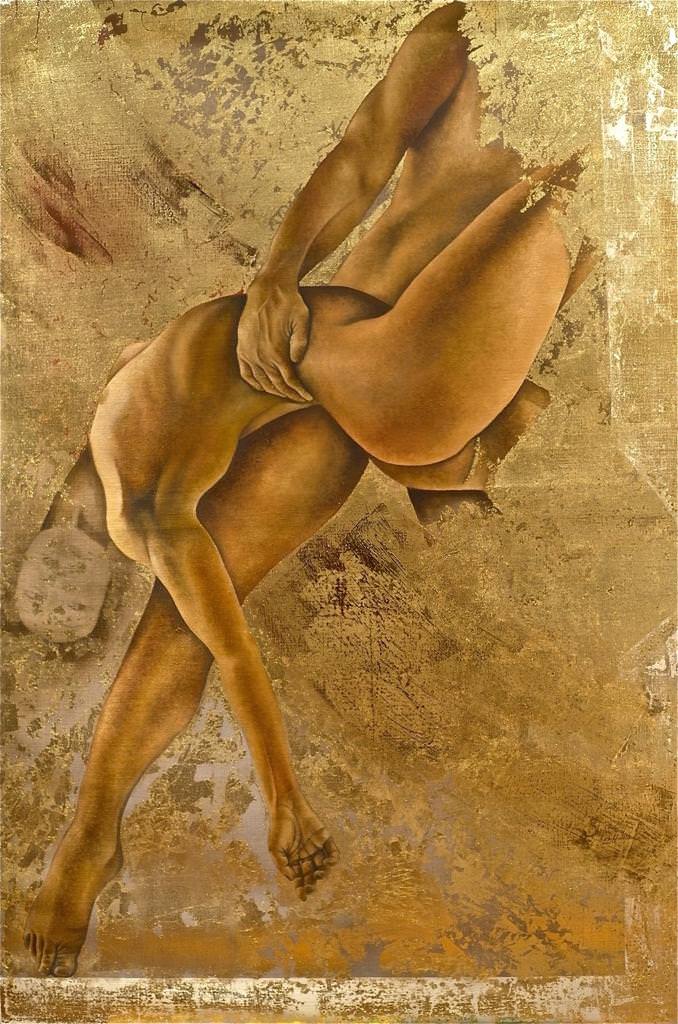 I am a figurative painter, Always use oil paint on raw linen. I like to use gold leaf interfering with the painting in my works.