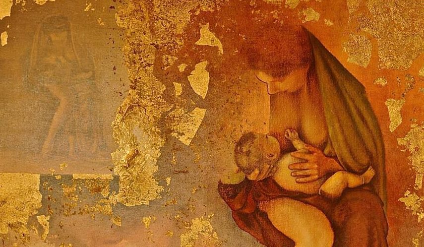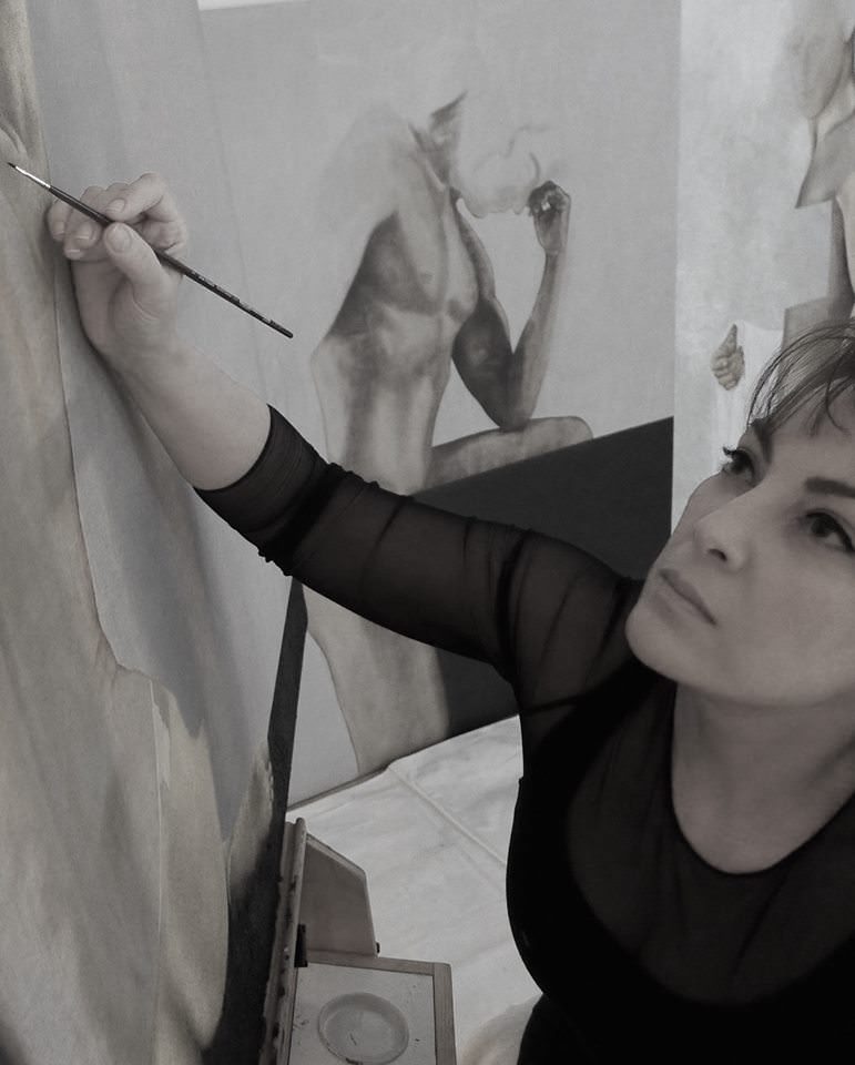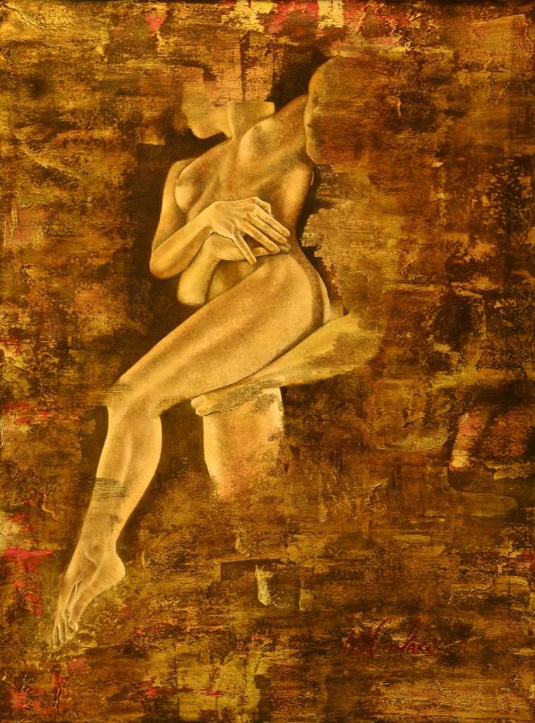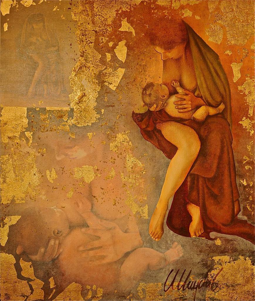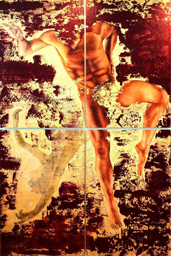 I am a figurative painter, Always use oil paint on raw linen. I like to use gold leaf interfering with the painting in my works.
