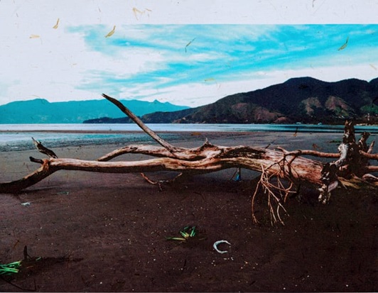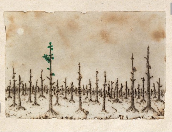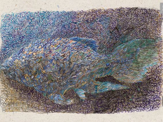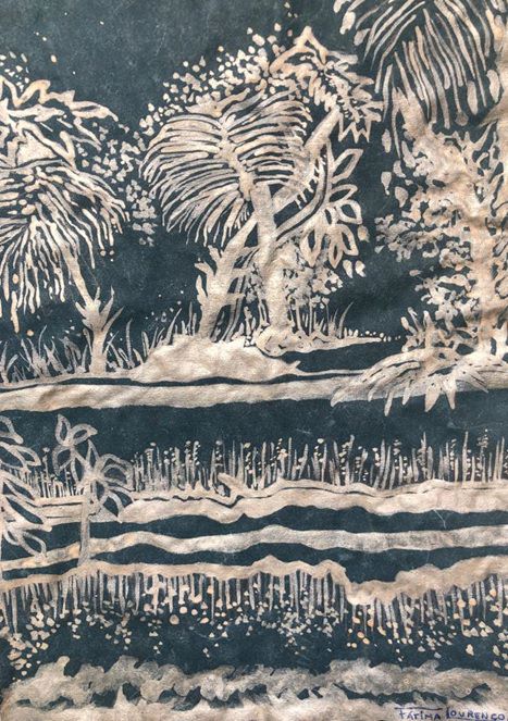 Instalación de Rita Caruzzo (Fig. 1) comienza este paseo por un hermoso sendero de hojas, de donde se origina el rol en sí. Como si cayeran, llenan la tierra y caminan por ahí, de colores, dibujos de tejido, pinturas y collages. En el medio del camino, el baúl (Fig. 2) que perdió sus hojas de Sonia Botture, es inerte y reseco, como si buscara un respiro en el agua del mar, protegido bajo el manto azul del cielo. Con la técnica de pirograbado, la hoja de papel se quemó con electricidad y fuego, de la mano del artista Fábio Souza, quien construyó una escena desoladora (Fig. 3) y sin vida, ablandado por las pequeñas hojas verdes que parecen insistir en vivir. El paisaje X de Fátima Lourenço (Fig. 4) esta lleno de naturaleza. Representado por el delicado monocromo, el fondo oscuro resalta el color plateado de su acuarela, como si estuviera tejiendo un hermoso bordado. El pez de Paulo Sayeg (Fig. 5) nadar libremente en el mar azul bajo los reflejos que impregnan el agua. Con técnica mixta es posible reconocer líneas de tonos azules y lilas que se entrecruzan para proporcionar los efectos de luz y oscuridad.. Todavía paseando por los temas de la naturaleza, el flamenco rosado de Flavie observa el verde indescriptible del mar.