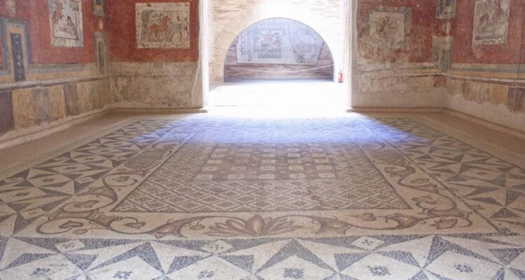 Fig. 2 -Pintura fresco, del siglo IV en estuco en una habitación, con 2,10 m de altura, 6,75 m de largo y 5,90 de largura. Las pinturas presentan escenas de caza, con los carros impulsados ​​por caballos. Los caballos son los principales motivos de las escenas. Las imágenes se formulen y se adornan con guirnaldas y banderas. Las partes superior e inferior están decoradas con figuras geométricas de colores. Foto de Lorenzo Plana Torres. Imagen de autoría y titularidad del "Archivo Fotográfico" de MNAR y de propiedad del "Museo Nacional de Arte Romano de Mérida".