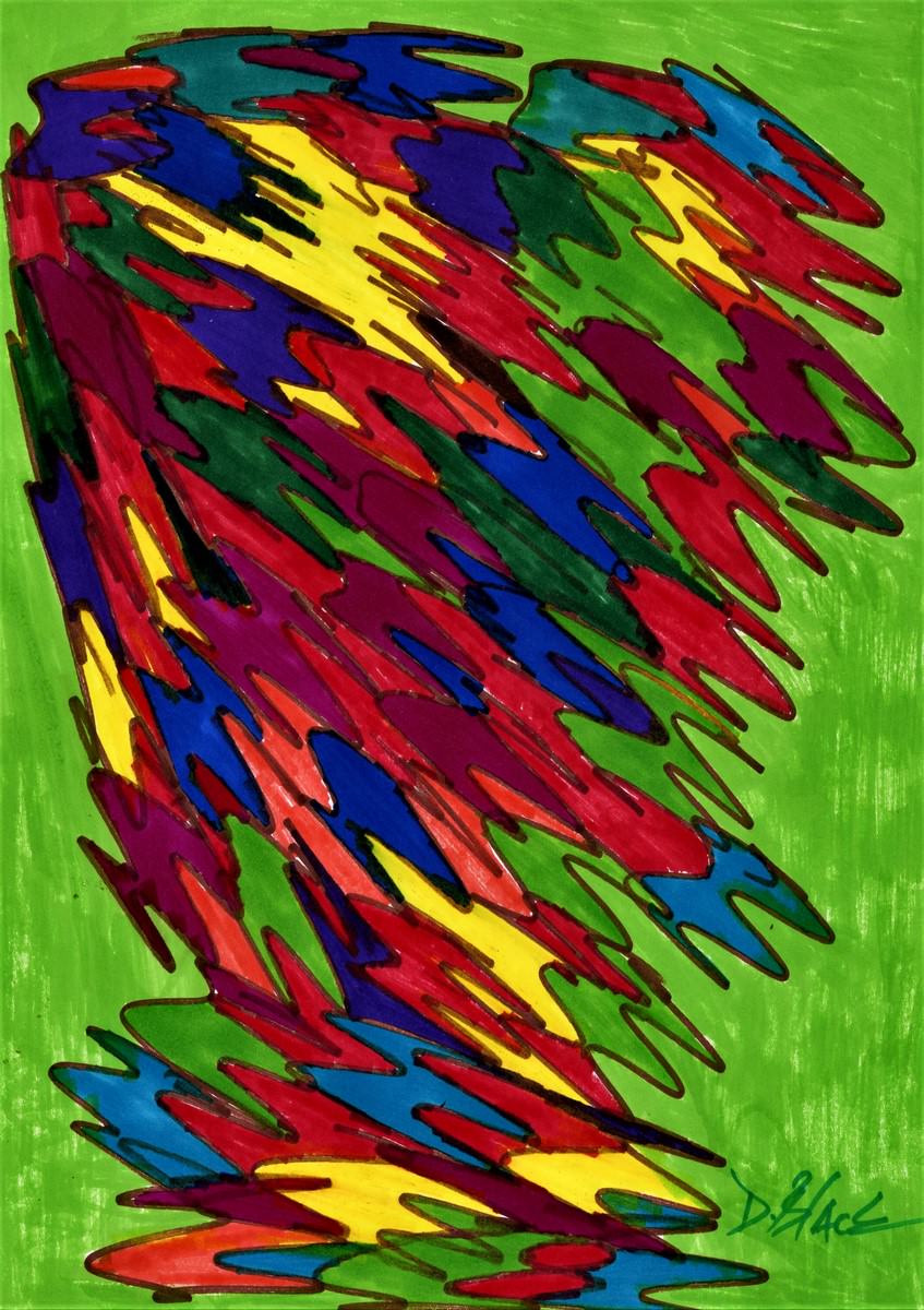 Mis primeros trabajos creativos comenzaron en papel., usando cuatro colores primarios – Azul, negro, rojo y verde. Me tomó muchos años de práctica y mucho apoyo de amigos y familiares antes de probar una paleta más vibrante y variada.. También comencé a experimentar con diferentes materiales. – creando obras de arte en madera, usar acrílico o pegar cerámica sobre madera para formar esculturas tridimensionales. El uso de pegamento caliente directamente en la pantalla ocurrió por casualidad al pegar piezas de cerámica sobre madera.; la cerámica se separó de la madera por accidente dejando diseños muy interesantes, así que decidí seguir creando imágenes usando una mezcla de pegamento termofusible y acrílico sobre lienzo y madera..