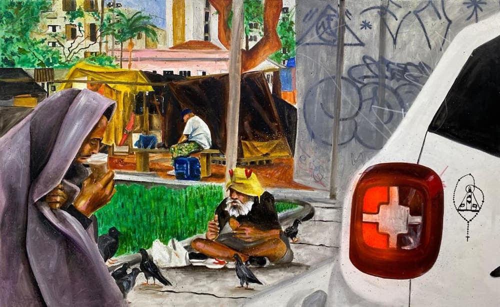 As 17 Las pinturas tienen como tema las poblaciones humildes que viven en las aceras, Okupas y albergues de São Paulo. “El afecto se trata de vínculos afectivos pero también de lo que afectar“, explica el artista, citando acciones caritativas y el compromiso del sacerdote en la lucha contra aparofobia – hostilidad hacia las personas sin hogar (y contra los pobres en general) que se manifiesta a través de acciones del poder público y privado. Algunas de las pantallas reproducen escenas de Lancelotti ofreciendo comida y agua., cuidar a los niños y hablar con las personas sin hogar; otros son retratos de los propios residentes, en una narración que alterna la consternación y la esperanza.