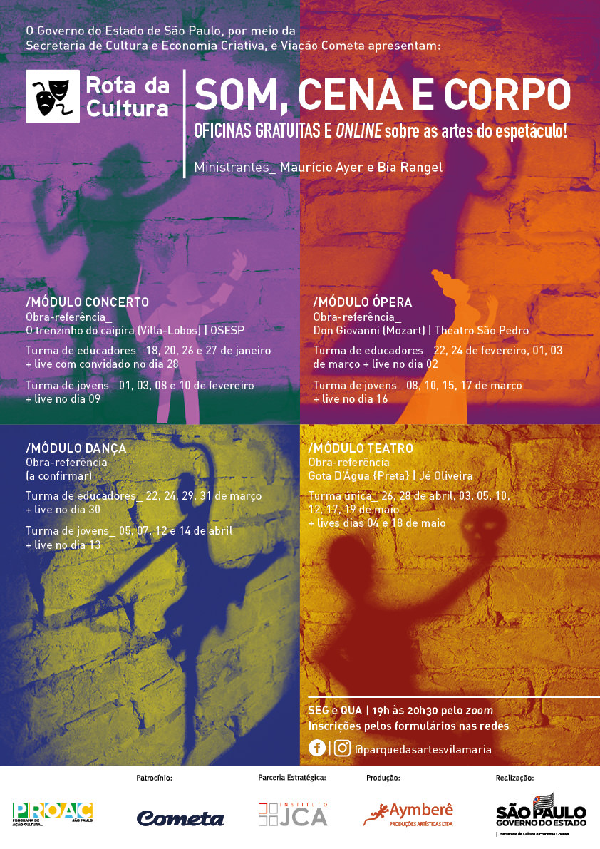Según Patrícia Ceschi, director de Aymberê Produções Artísticas, responsable de la gestión de proyectos, el programa presenta un ciclo de encuentros reflexivos y creativos sobre lenguajes de concierto, Opera, danza y teatro, mediado por educadores con experiencia en los temas. Cada uno de los lenguajes artísticos se estudiará a partir de una obra disponible. En línea.
