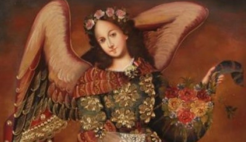 – Iconografía y el sincretismo. distanciamiento arte producido por los indios y mestizos de cánones europeos, las diferencias en la lectura de las imágenes producidas en la posición y sin perspectiva más estática con inserciones de costumbres y símbolos indígenas. La representación profusa de los arcángeles y la iconografía característica de los arcabuceros Ángeles.