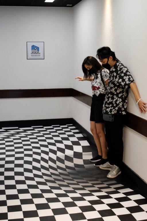 Hasta finales de febrero, las personas podrán disfrutar de desafíos a su inteligencia pasando por los campos de las sensaciones con obras como atravesar un colorido túnel., como si los colores se derrumbaran en el techo (Fig. 1). La sensación de lo grande y lo pequeño se altera cuando la mente percibe exageraciones en los tamaños.. El sentido de la perspectiva cambia y puede ser que las personas no parezcan tener el mismo tamaño cuando están parados uno al lado del otro en muebles de diferentes tamaños. (Figuras 2 y 3). La impresión que se puede tener de profundidad se confunde cuando el dibujo en el suelo no se corresponde con lo que se estudia en perspectiva y punto de fuga. (Fig. 4). En esta imagen, las líneas sinuosas del suelo a cuadros y la sombra acentúan la percepción errónea de cómo se ve realmente el suelo.. Recordando una clase de dibujo, esta y tantas otras obras permiten un viaje a lo imposible.