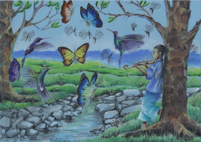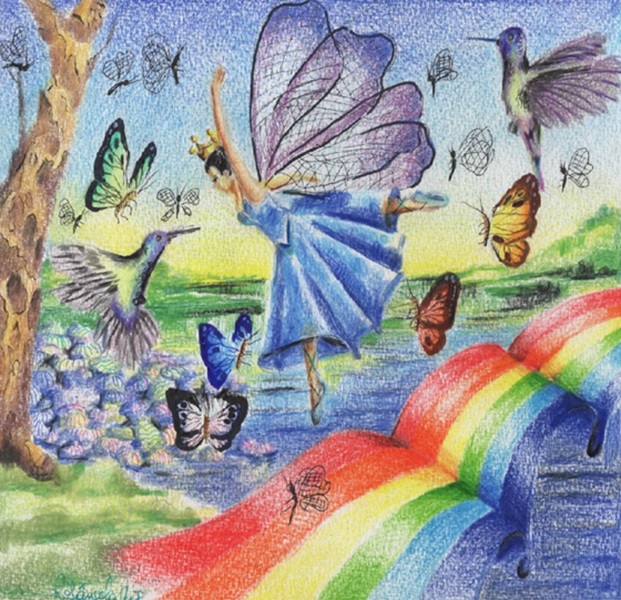 Luego vino el violinista solitario (Fig. 1), atrayendo el mundo de las mariposas hacia ti, como si uniera dos mundos ante él. Y justo después de la bailarina, que posiblemente habita este mundo dorado con sus mariposas y pájaros gigantes. Para cruzar esta fina línea que limita los dos mundos, es necesario pasear por un hermoso puente arcoiris que se mueve eternamente. en postura delicada, baile, ella cruza este camino de ida y vuelta, de ida y vuelta, hasta que encuentra al violinista y los dos, juntos, evolucionar hacia un mundo dorado y mucho mejor. con ellos, los elementos de la escena se distribuyen, sin que uno se superponga al otro, para que todos sean observados.