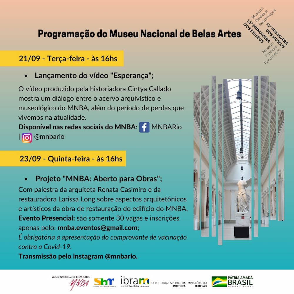 En el día 23 Septiembre, 5Feria de San, 16h, habrá una conferencia con la participación de la arquitecta Renata Casimiro y la restauradora Larissa Long, Abordar los aspectos arquitectónicos y artísticos de los trabajos de restauración y modernización del edificio del MNBA.. Esta reunión será en persona, pero solo para 30 participantes, con suscripciones de: [email protected]. Es obligatorio presentar prueba de vacunación contra Covid.. El evento será retransmitido por Instagram @mnbario.