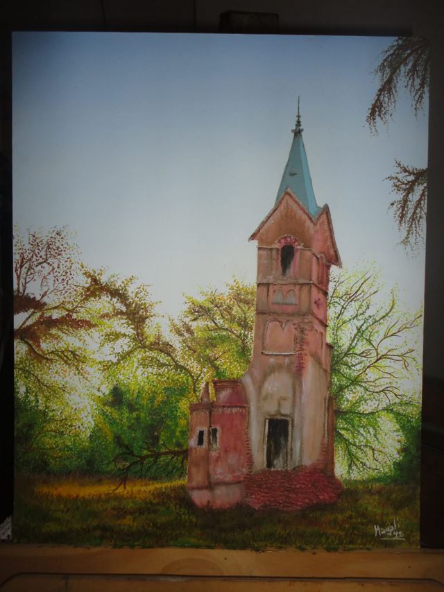 El pasado año, nos convocaron a pintar algo relacionado con nuestro pueblo: Carabelas, Provincia de Buenos Aires. Esto hace que junto a mi profesora, surgiera la idea de pintar lo , que fue a principios del siglo XX, El Palacio San Jacinto, perteneciente a la Condesa Argentina Maria Unzue de Alvear, del cual hoy se puede encontrar algunos cimientos de este imponente Palacio y de su Capilla, podemos apreciar tan solo una torre en pie.