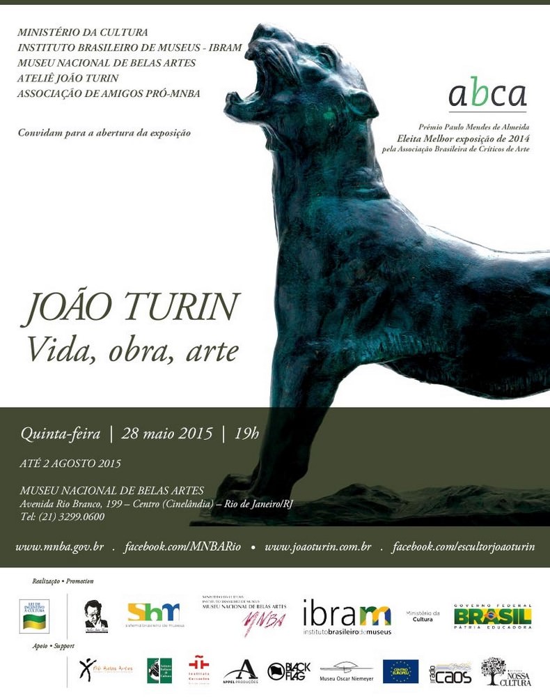 A partir do dia 28 de maio, será aberta, no Museu Nacional de Belas Artes, no Rio de Janeiro, a exposição “João Turin – Vida, Obra, Arte”, mostra que destaca a genialidade com a qual criou o escultor brasileiro João Turin (1878-1949). A exposição foi vencedora do prêmio Paulo Mendes de Almeida, concedido pela Associação Brasileira dos Críticas de Arte, na categoria ‘melhor exposição de 2014’.