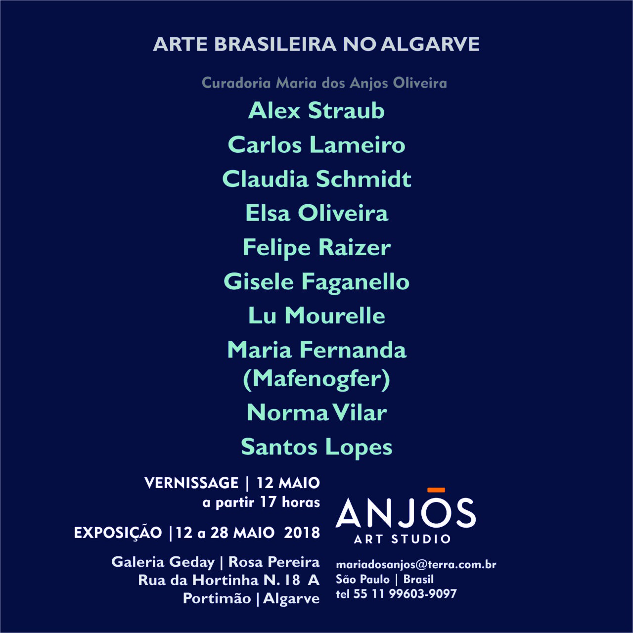 Em continuidade ao seu projeto “Maio na Europa” a Anjos Art Studio, e sua curadora Maria dos Anjos Oliveira, irá promover mais 3 exposições com artistas brasileiros. Mais duas em Portugal e uma em Vienna na Áustria. Conforme convites abaixo.