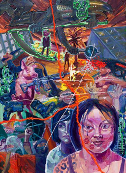 As pinturas do maranhense Thiago Martins de Melo exibem um barroco próprio, anacrônico e anárquico com cores vibrantes, cenários e situações ocupadas pelo que há de mais nefasto debaixo do céu e também por uma energia ancestral que se faz sentir em toda luta de quem resiste. Ele afirma que no lugar das esferas de protagonismo e da distribuição clássica de papéis, muitas vozes, antes condenadas às margens, revelam suas potências. Nessas conjunturas complexas, há arte e guerra, cálculo e misticismo, presságio e documentação.