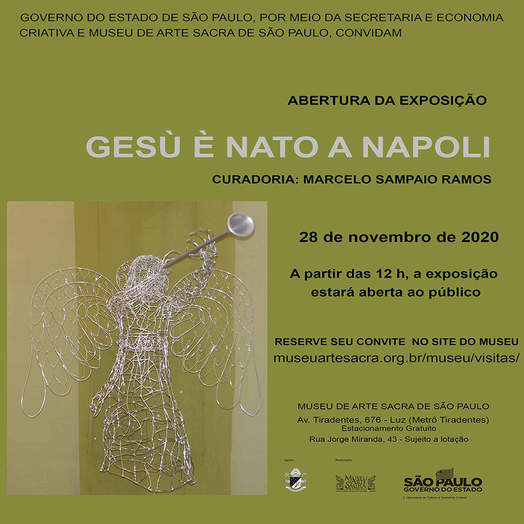 Museu de Arte Sacra de São Paulo – MAS/SP, instituição da Secretaria de Cultura e Economia Criativa do Estado de São Paulo, em conformidade com todos os protocolos definidos pelas áreas competentes, abre a exposição Gesù è nato a Napoli, sob curadoria de Marcelo Sampaio Ramos, em celebração às festas natalinas. O momento presente impede que tenhamos comemorações festivas; “a forma que encontramos para atingir o objetivo foi essa exposição, versando sobre a lenda, tão acalentada pelos Napolitanos, de que Jesus nasceu em sua cidade”, explica o diretor do MAS/SP, José Carlos Marçal de Barros.