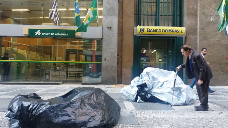 “Solos de Rua” é uma ação artística e urbana do …AVOA! Núcleo Artístico, dirigida por Luciana Bortoletto. A montagem não está nos palcos italianos, em teatros, em salas de espetáculos. Está nas ruas do centro de São Paulo. Mais precisamente na confluência das ruas XV de Novembro e Rua do Tesouro. O público que passa – e os muitos que param – assistem a uma intervenção cênica, urbana, artística e… Inquietadora. É característica do grupo, que completou dez anos de estrada em 2016, estar nas ruas, dançar nas ruas, se misturar às pessoas e coisas da rua. Aos que passam e aos que assistem, fica a incerteza e a dúvida do que estão presenciando.
