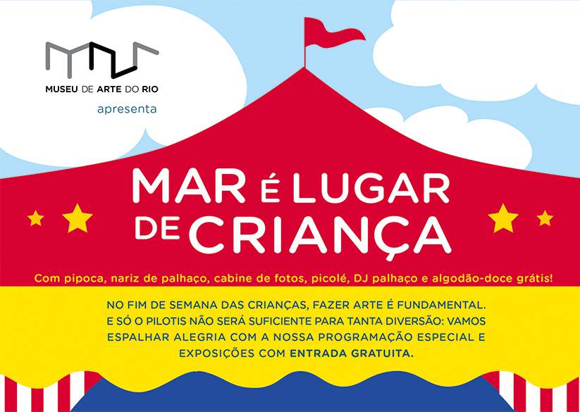 MAR é lugar de criança. E, para comemorar o dia delas, o Museu de Arte do Rio fará uma grande festa com diversas atividades gratuitas. Além das exposições em cartaz, haverá oficinas – samba, circo e origami –, caça ao tesouro, teatro e distribuição de pipoca, picolé, algodão doce e nariz de palhaço nos pilotis. Os visitantes também poderão registrar o momento em uma cabine de fotos divertidas, que serão impressas na hora e também enviadas diretamente ao Facebook dos responsáveis.