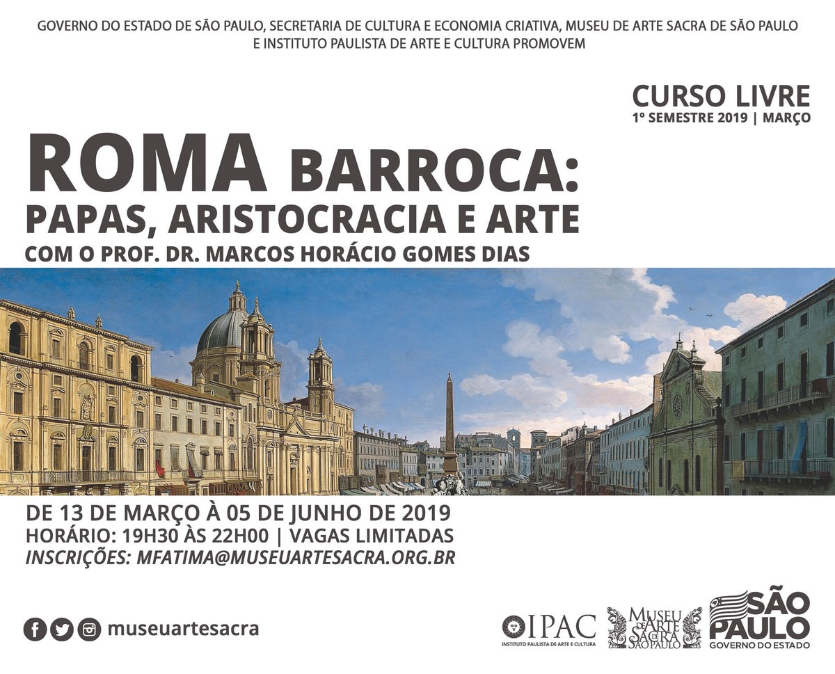 O Museu de Arte Sacra promove, o Curso Livre: “Roma Barroca: Papas, Aristocracia e Arte” com o Prof. Dr. Marcos Horácio Gomes Dias.