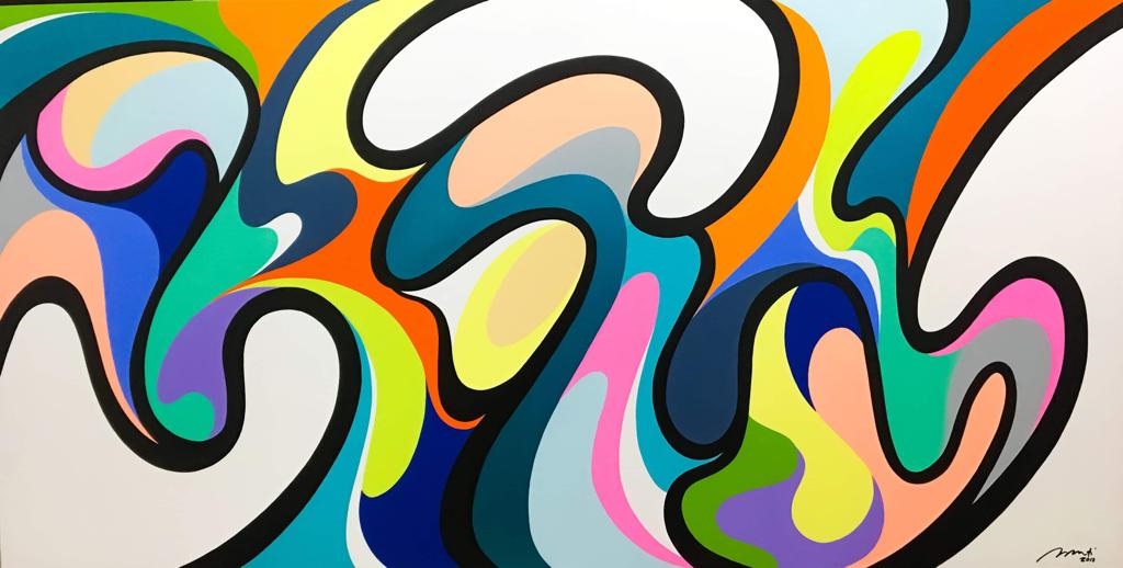 A grande maioria de minhas obras, tinta acrílica sobre tela, e em alguns trabalhos menores também mesclo com o uso de canetas Posca e Verniz spray contra Raios UV para finalização e acabamento.