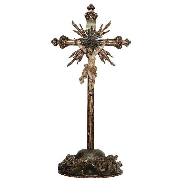 Junto também vai a leilão o lote 150, que é uma imagem de madeira esculpida intitulada “Cristo Crucificado”, que também é outra composição de Aleijadinho. O trabalho também foi elaborado no século XVIII e possui 1,03m de altura total. Também produzida em Minas Gerais, a criação representa Cristo na cruz com um lenço de pano cobrindo a nudez.