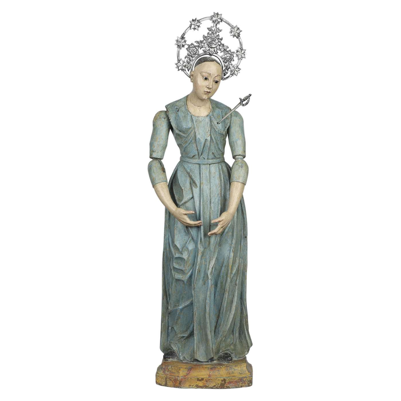 De 8 e 9 de setembro, a Dutra Leilões realiza o leilão de importantes obras de arte. Entre elas está a escultura “Nossa Senhora das Dores”, feita por Antônio Francisco Lisboa, popularmente conhecido como Aleijadinho. A estátua foi produzida no século XVIII, em Minas Gerais, e possui 73cm de altura. O lote é o 175 do evento. De acordo com Luiz Fernando Dutra, leiloeiro oficial do evento, para este lote acompanham o resplendor com arcos estrelados e punhal com crisólitas no punho, todos de prata.