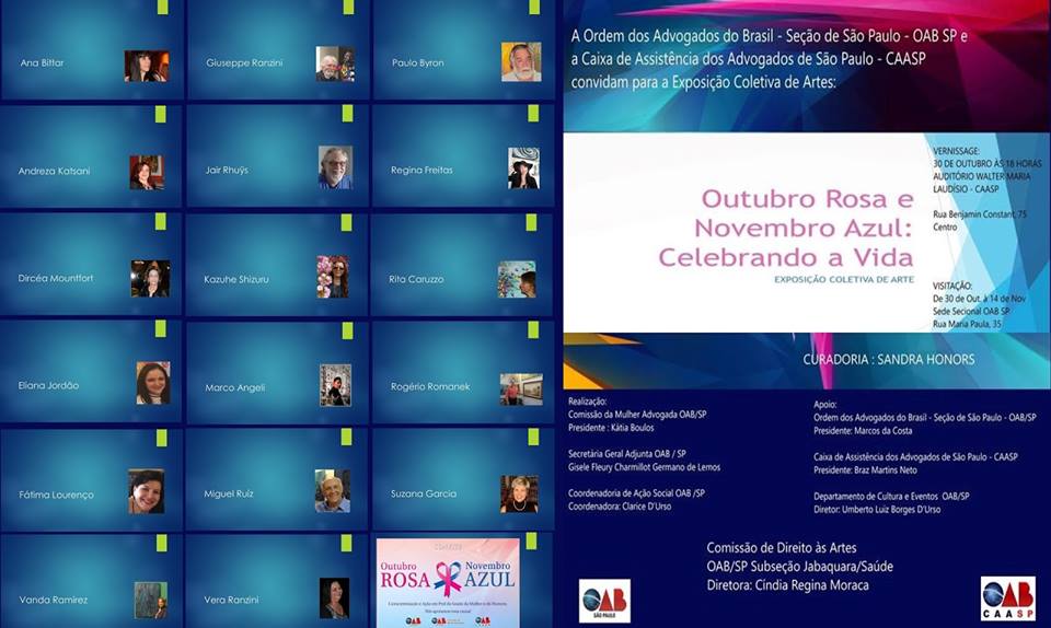Na CAASP, Caixa de Assistência dos Advogados de São Paulo, a conscientização e a prevenção do câncer de mama e de próstata foram levadas a sério e a Arte teve papel fundamental nessa campanha. Esse foi o tema da exposição da curadora Sandra Honors, com o apoio da Dra. Cíndia Regina Moraca, Diretora da Comissão de Direito às Artes da OAB, SP.