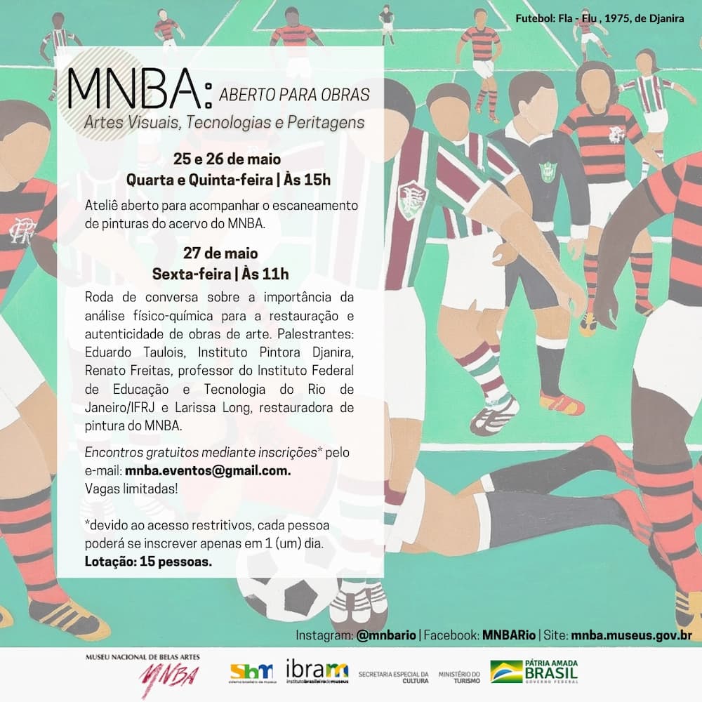 Já na sexta-feira, dia 27 de maio, será realizada uma roda de conversa com o Eduardo Taulois, fundador do Instituto Djanira, cuja missão é preservar, pesquisar e disseminar a obra e a memória de Djanira, uma das mais importantes artistas brasileiras, o professor Renato Freitas, do Instituto Federal de Educação e Tecnologia do Rio de Janeiro/IFRJ Laboratório de Instrumentação e Simulação Computacional Científica Aplicada/LISComp e a Conservadora-Restauradora do MNBA, Larissa Long.