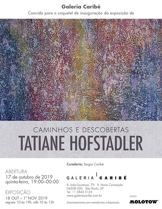 A artista plástica Tatiane Hofstadler exibe a série inédita “Caminhos e Descobertas” em mostra individual na Galeria Caribé, com curadoria de Sergio Caribé. As 18 telas em exposição representam impressões e registros de vida de uma artista que pode conviver com diferentes sensações e experiencias.
