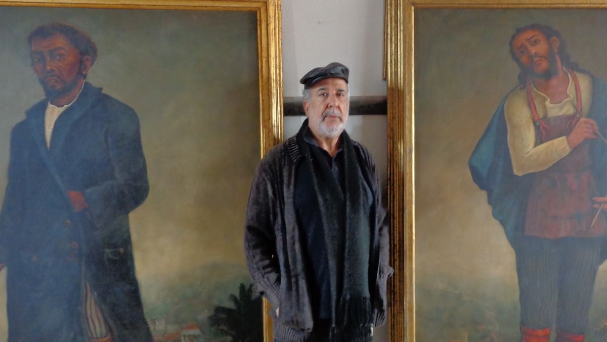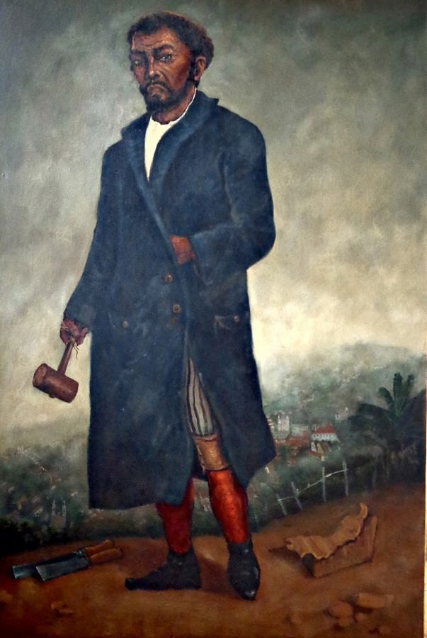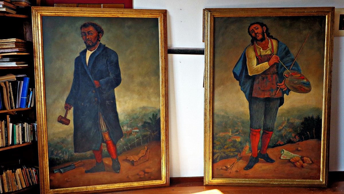Antônio Francisco Lisboa, o Aleijadinho, nascido em Ouro Preto, foi o maior artista plástico brasileiro de todos os tempos. Para pintar seu retrato, levei mais de 15 anos pesquisando uma imagem que se aproximasse verdadeiramente de sua fisionomia. Esse retrato tem muito das características que Joana, a nora do Aleijadinho, passa ao historiador Rodrigo José Ferreira Bretas numa entrevista em 1858, 44 anos após a morte do escultor. É quase um retrato “falado”. Nessa pintura em tamanho natural, o artista foi representado mais jovem, tendo Ouro Preto ao fundo com uma vista para a Igreja de São Francisco, sua obra prima, e a Matriz de Antônio Dias onde o mestre foi sepultado. Confira abaixo: