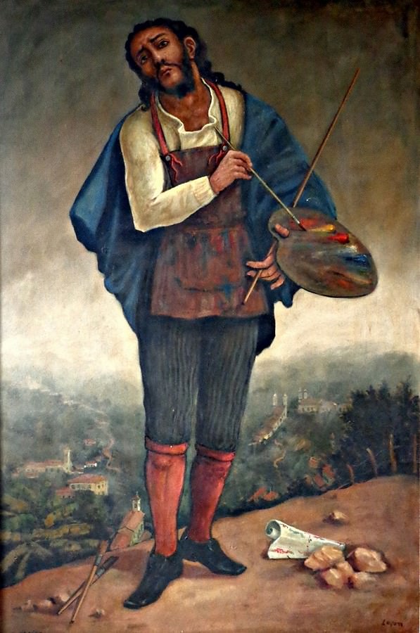 Manoel da Costa Ataíde, o maior pintor do barroco brasileiro, nascido e sepultado em Mariana, filho de portugueses, até o devido momento não tinha nenhum retrato pintado de sua figura. Para criar esse retrato eu tomei como referência uma pintura de São Lucas, protetor dos pintores, que se encontra na Igreja Bom Jesus do Serro e na figura do Rei Davi do forro da Igreja São Francisco de Assis de Ouro Preto. Ambas as figuras são muito semelhantes entre si e me levaram a supor que sejam retratos de Ataíde. O São Lucas do Serro foi pintado por um seguidor de Ataíde que certamente quis fazer uma homenagem ao mestre colocando na imagem do Santo a figura do artista. Já o Rei Davi do forro da Igreja de São Francisco de Ouro Preto foi pintado pelo próprio Ataíde e muitos historiadores supõem que seja seu autorretrato. Confira abaixo: