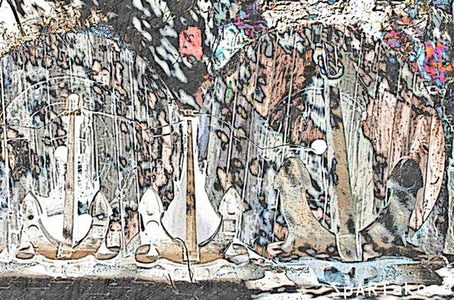 “Âncoras, 2013″ – Este é um exemplo característico de uma pintura digital. A foto original foi tirada em Istambul, em um beco cheio de armazéns com equipamentos de barco. As âncoras estavam a mostra fora de uma dessas lojas. A imagem final tem a aparência de uma pintura real, ao invés de uma fotografia.