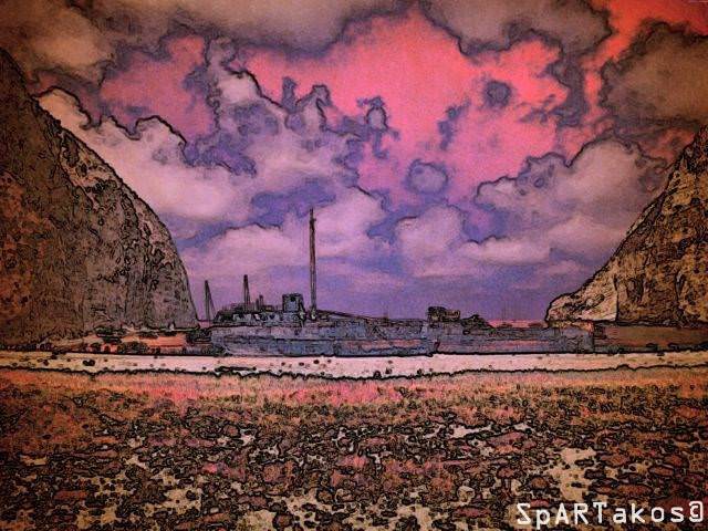 “O Outro Lado, 2013″ – A foto original dessa pintura digital foi tirada na mundialmente famosa praia de Navagio (Naufrágio) na ilha de Zakynthos na Grécia. Existe um naufrágio real nessa praia deserta, o qual é acessível somente por barco. A principal cena que as pessoas tem contato é em frente a essa praia. Essa imagem mostra o outro lado, a partir do interior da praia voltado para o céu, por isso nome da obra.