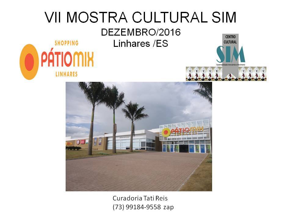O Centro Cultural SIM inaugura nesta segunda-feira 05/12/2016, uma nova filial, em parceria com o Shopping Patiomix Linhares e estará realizando a partir desta data até 28/12/2016 a VII Mostra Cultural SIM com a curadoria de Tati Reis, no Centro Cultural SIM, unidade Linhares, localizado no Shopping Pátiomix. A mostra contará com diversos artistas talentosos e nacionalmente conhecidos.