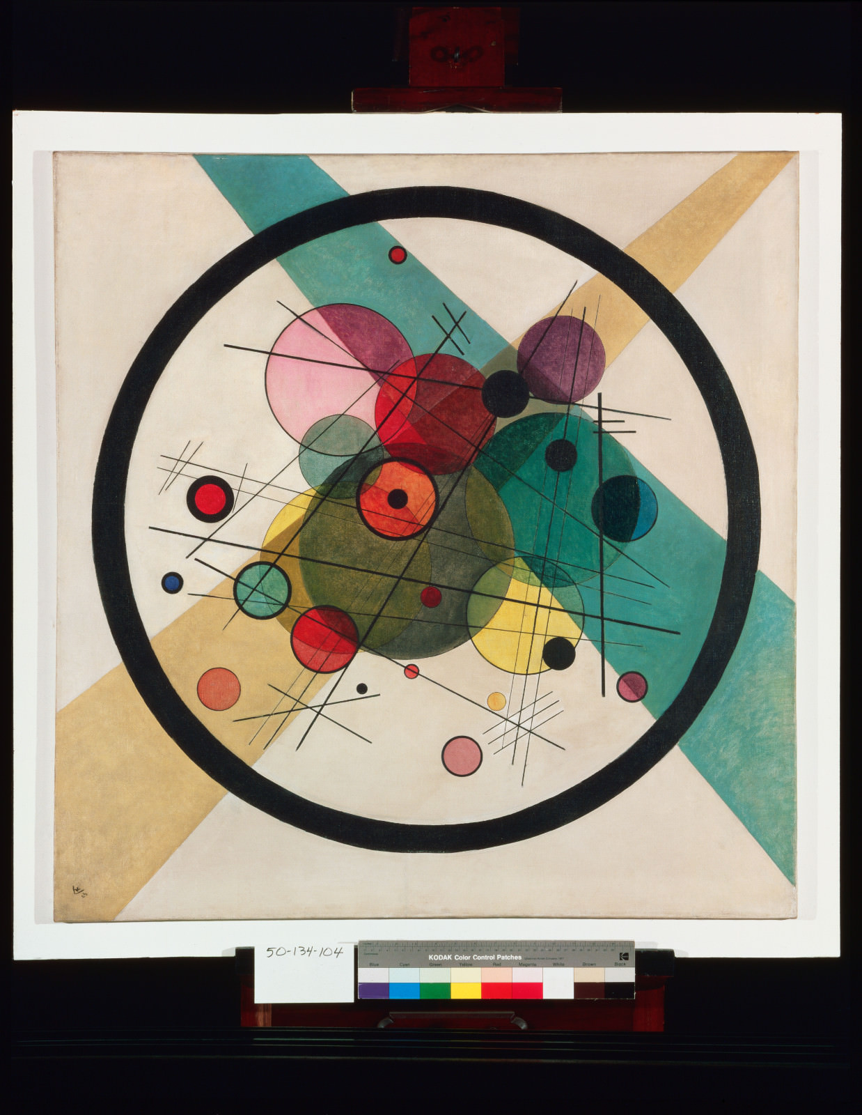 无花果. 5 - 瓦西里·康定斯基, 在一个圈子圈子, 1923, 布面油画, 38 7/8 x 37 5/8 英寸 (98.7 x 95.6 厘米) 陷害: 44 1/4 × 43 1/8 × 2 3/4 英寸 (112.4 × 109.5 × 7 厘米). 费城艺术博物馆, 路易丝和沃尔特阿伦斯伯格收藏, 1950-134-104.
