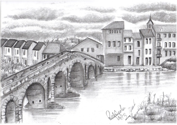 从顶部到底部, 所以,你的手不要上画了什么. 然后轻轻涂抹云彩, 在顶部留下较深的底部和打火机. 所以,铅笔笔画不出现在云, 工作在圆周运动光残肢. 做同样的这座桥和它的石头. 粉刷屋顶, 窗户和墙壁的房屋. 让一些在白墙的房子. 坚持用树桩, 老方面. 树木, 草和植物是同样的方式. 刚刚做冒险并发布与机械铅笔, 模仿树的树枝和灌木的叶子. 完成的房屋和桥梁反射, 在水中, 可以怎样的树桩.