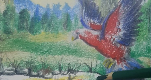 重要的是要注意,水代表着一面镜子,反映了所有,就是以上. 这个湖, 必须是天空的颜色, 布鲁斯音乐是什么, 丁香, 红色, 橙色和黄色. 是绿色的森林和动物的不同的颜色, 只是每个下面. 在水中, 鱼儿 (无花果. 5) 被淹没, 所以它的颜色可能不是很生动. 他们仍然收到一个轻微的蓝色, 由于水的颜色. 在这个场景中, 水运动是光, 有小涟漪, 那片段的图像, 反映出只有颜色和草图. 腿部的火烈鸟和灌木的叶子的风险, 必须轻轻地挠, 不规则, 下面这些, 从顶部到底部, 稍有波浪, 好像他们正在散布于逐浪. 别忘了把它放在水中白色的某些部分, 代表这些轻微的波浪. 完成整个加强 图, 与黑色的地方, 阳光并不影响.