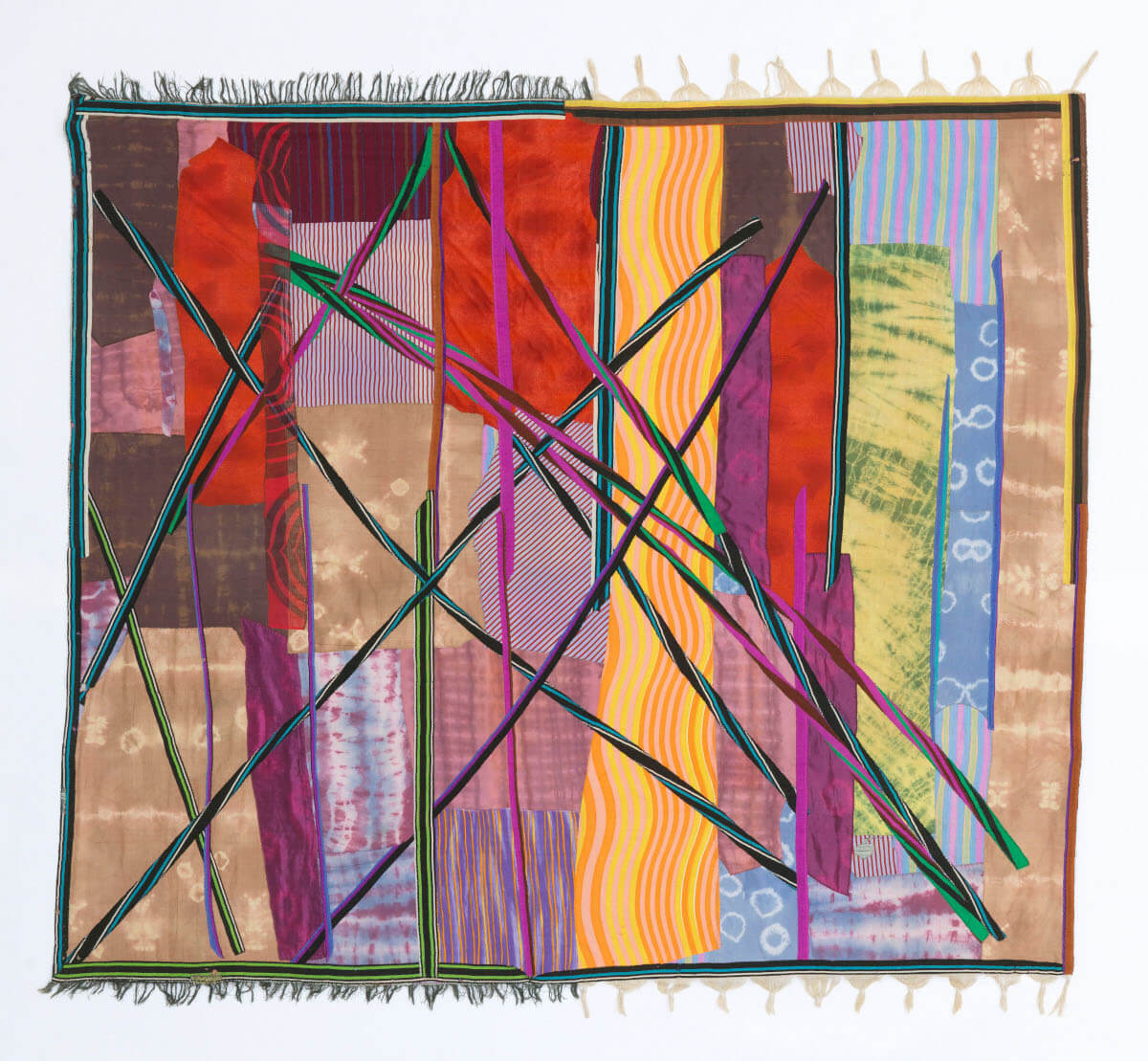 Casa do Povo 的二楼收到八 墙毯, 大型彩色挂毯, 和两个视频. 如果在远处 墙毯 可能看起来像个人视觉艺术家的作品, 在展览一楼的参观者知道他们是编舞团体集体过程的一部分. 在许多人手中编织, 该 墙毯 是共同努力的结果 室内舞四重奏, 舞者集体成立于 1954, 那将陪伴诺亚直到她生命的尽头. 这群人住, 几十年来一起工作和旅行, 开展一系列合作和集体进程, 受到日常生活和共享经验的激励.