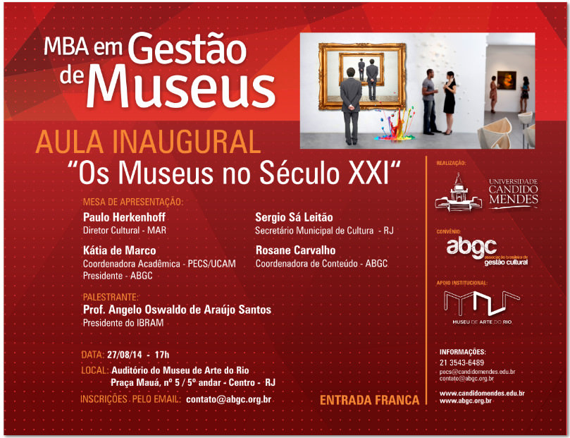 一 大学坎迪多·门德斯 (UCAM), 在他们的研究生课程认可的卓越, 工商管理硕士, 打开 注册一个创新LATU意义上的研究生课程格式 工商管理硕士 (MBA): 博物馆管理. 课程将通过卓越的学术人才和巨大的市场经验教. 研讨会补充学习, 通过分享在巴西和国外的客户体验. 那里 11 UCAM年开始成功的合作伙伴关系 文化管理协会巴西 (ABGC) 和, 自, 听到市场,设计课程,以满足这些需求,并提供了人谁愿意接受新的职业生涯的新机遇. 此格式的第一道菜, 文化管理, 已成为执行制片人之间的参考和许多其他铺平了道路.